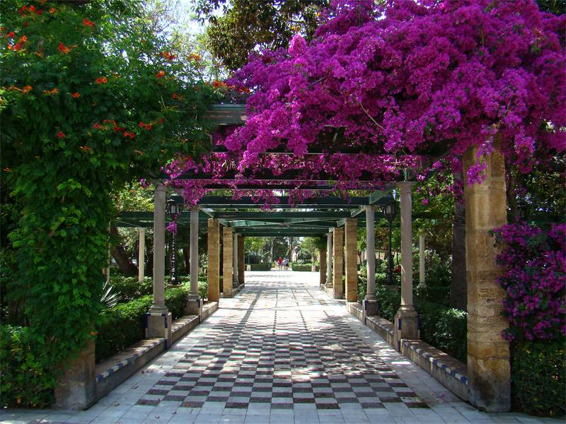 Una sucesión de árboles y flores que se entremezclan con elementos de forja como arcos o columnas…lo que devuelve una bella estampa