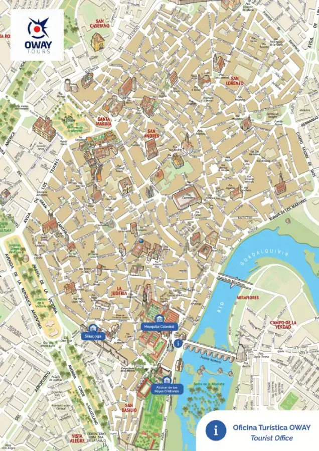 En este mapa localizarás los monumentos más importantes y las principales excursiones en Córdoba. Además, el guía turístico te indicará zonas y lugares para comer. ¡No lo dudes y reserva las mejores visitas guiadas en Córdoba capital con OWAY Tours!